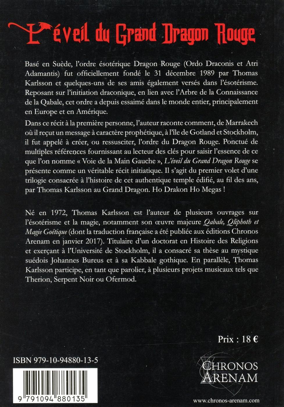 Basé en Suède, l'ordre ésotérique Dragon Rouge (Ordo Draconis et Atri Adamantis) fut officiellement fondé le 31 décembre 1989 par Thomas Karlsson et quelques-uns de ses amis également versés dans l'ésotérisme. Reposant sur l'initiation draconique, en lien avec l'Arbre de la Connaissance de la Qabale, cet ordre a depuis essaimé dans le monde entier, principalement en Europe et en Amérique. Dans ce récit à la première personne, l'auteur raconte comment, de Marrakech où il reçut un message à caractère prophétique, à l'île de Gotland et Stockholm, il fut appelé à créer, ou ressusciter, l'ordre du Dragon Rouge. Ponctué de multiples références fournissant au lecteur des clés pour saisir l'essence de ce que l'on nomme "Voie de la Main Gauche", L'éveil du Grand Dragon Rouge se présente comme un véritable récit initiatique. Il s'agit du premier volet d'une trilogie consacrée à l'histoire de cet authentique temple édifié, au fil des ans, par Thomas Karlsson au Grand Dragon. Ho Drakon Ho Megas !