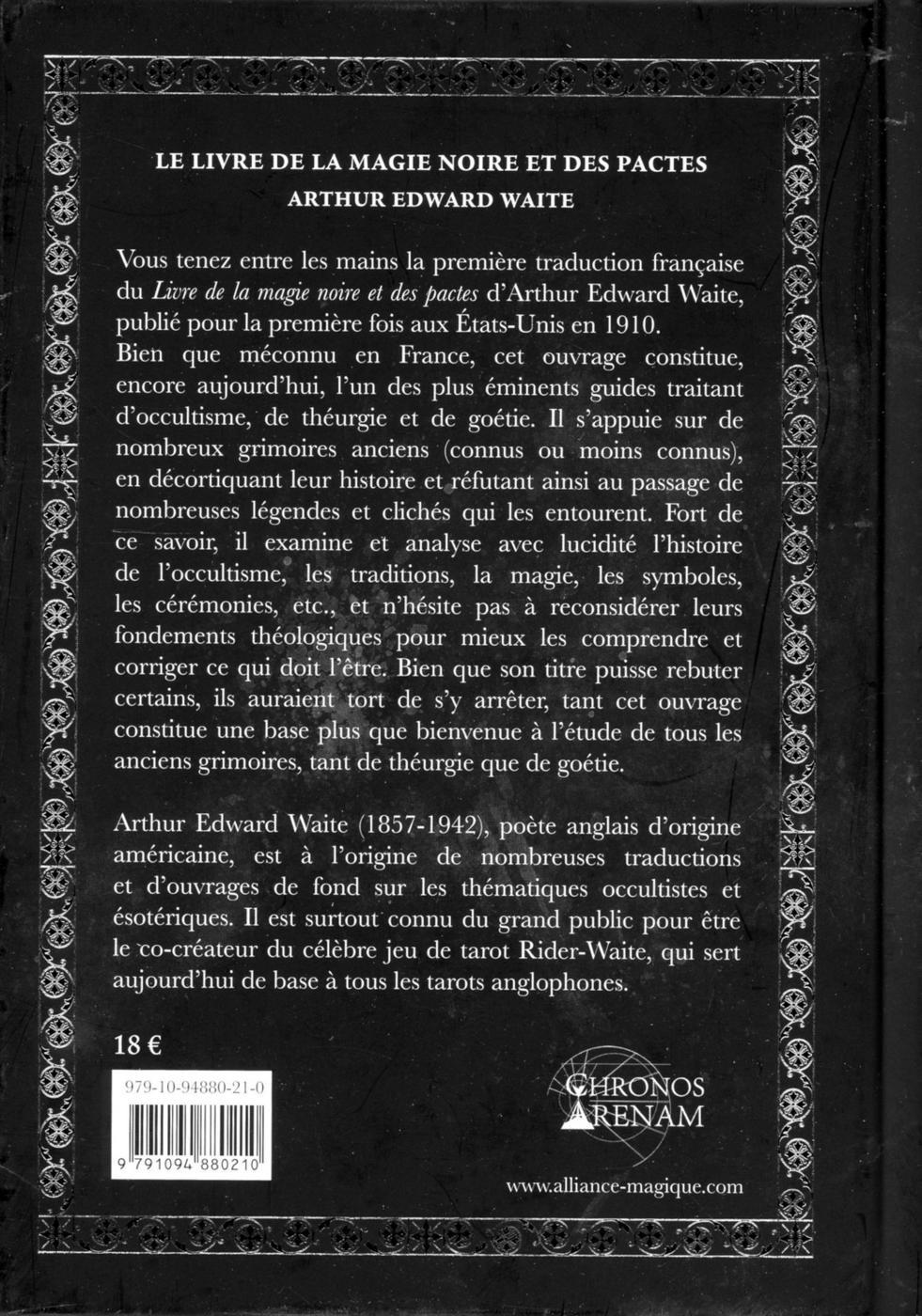 Vous tenez entre les mains la première traduction française du Livre de la magie noire et des pactes d’Arthur Edward Waite, publié pour la première fois aux États-Unis en 1910. Bien que méconnu en France, cet ouvrage constitue, encore aujourd’hui, l’un des plus éminents guides traitant d’occultisme, de théurgie et de goétie. Il s’appuie sur de nombreux grimoires anciens (connus ou moins connus), en décortiquant leur histoire et réfutant ainsi au passage de nombreuses légendes et clichés qui les entourent. Fort de ce savoir, il examine et analyse avec lucidité l’histoire de l’occultisme, les traditions, la magie, les symboles, les cérémonies, etc., et n’hésite pas à reconsidérer leurs fondements théologiques pour mieux les comprendre et corriger ce qui doit l’être. Bien que son titre puisse rebuter certains, ils auraient tort de s’y arrêter, tant cet ouvrage constitue une base plus que bienvenue à l’étude de tous les anciens grimoires, tant de théurgie que de goétie. Arthur Edward Waite (1857-1942), poète anglais d’origine américaine, est à l’origine de nombreuses traductions et d’ouvrages de fond sur les thématiques occultistes et ésotériques. Il est surtout connu du grand public pour être le co-créateur du célèbre jeu de tarot Rider-Waite, qui sert aujourd’hui de base à tous les tarots anglophones.