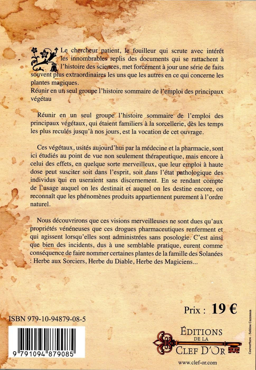 Le chercheur patient, le fouilleur qui scrute avec intérêt les innombrables replis des documents qui se rattachent à l'histoire des sciences, met forcément à jour une série de faits souvent plus extraordinaires les uns que les autres en ce qui concerne les plantes magiques. Réunir en un seul groupe l'histoire sommaire de l'emploi des principaux végétaux, qui étaient familiers à la sorcellerie, dès les temps les plus reculés jusqu'à nos jours, est la vocation de cet ouvrage. Ces végétaux, usités aujourd'hui par la médecine et la pharmacie, sont ici étudiés au point de vue non seulement thérapeutique, mais encore à celui des effets, en quelque sorte merveilleux, que leur emploi à haute dose peut susciter soit dans l'esprit, soit dans l'état pathologique des individus qui en useraient sans discernement. En se rendant compte de l'usage auquel on les destinait et auquel on les destine encore, on reconnaît que les phénomènes produits appartiennent purement à l'ordre naturel. Nous découvrirons que ces visions merveilleuses ne sont dues qu'aux propriétés vénéneuses que ces drogues pharmaceutiques renferment et qui agissent lorsqu'elles sont administrées sans posologie. C'est ainsi que bien des incidents, dus à une semblable pratique, eurent comme conséquence de faire nommer certaines plantes de la famille des Solanées : Herbe aux Sorciers, Herbe du Diable, Herbe des Magiciens...
