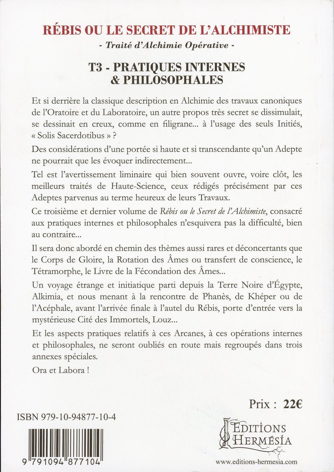Et si derrière la classique description en Alchimie des travaux canoniques de l'Oratoire et du Laboratoire, un autre propos très secret se dissimulait, se dessinait en creux, comme en filigrane... à l'usage des seuls Initiés, "Solis Sacerdotibus" ? Des considérations d'une portée si haute et si transcendante qu'un Adepte ne pourrait que les évoquer indirectement... Tel est l'avertissement liminaire qui bien souvent ouvre, voire clôt, les meilleurs traités de Haute-Science, ceux rédigés précisément par ces Adeptes parvenus au terme heureux de leurs Travaux. Ce troisième et dernier volume de Rébis ou le Secret de l'Alchimiste, consacré aux pratiques internes et philosophales n'esquivera pas la difficulté, bien au contraire... Il sera donc abordé en chemin des thèmes aussi rares et déconcertants que le Corps de Gloire, la Rotation des Ames ou transfert de conscience, le Tétramorphe, le Livre de la Fécondation des Ames... Un voyage étrange et initiatique parti depuis la Terre Noire d'Egypte, Alkimia, et nous menant à la rencontre de Phanès, de Khéper ou de l'Acéphale, avant l'arrivée finale à l'autel du Rébis, porte d'entrée vers la mystérieuse Cité des Immortels, Louz... Et les aspects pratiques relatifs à ces Arcanes, à ces opérations internes et philosophales, ne seront oubliés en route mais regroupés dans trois annexes spéciales. Ora et Labora !