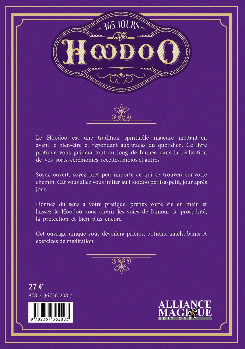 Le Hoodoo est une tradition spirituelle majeure mettant en avant le bien-être et répondant aux tracas du quotidien. Ce livre pratique vous guidera tout au long de l’année dans la réalisation de vos sorts, cérémonies, recettes, mojos et autres. Soyez ouvert, soyez prêt peu importe ce qui se trouvera sur votre chemin car vous allez vous initier au Hoodoo petit-à-petit, jour après jour. Donnez du sens à votre pratique, prenez votre vie en main et laissez le Hoodoo vous ouvrir les voies de l’amour, la prospérité, la protection et bien plus encore. Cet ouvrage unique vous dévoilera prières, potions, autels, bains et exercices de méditation.