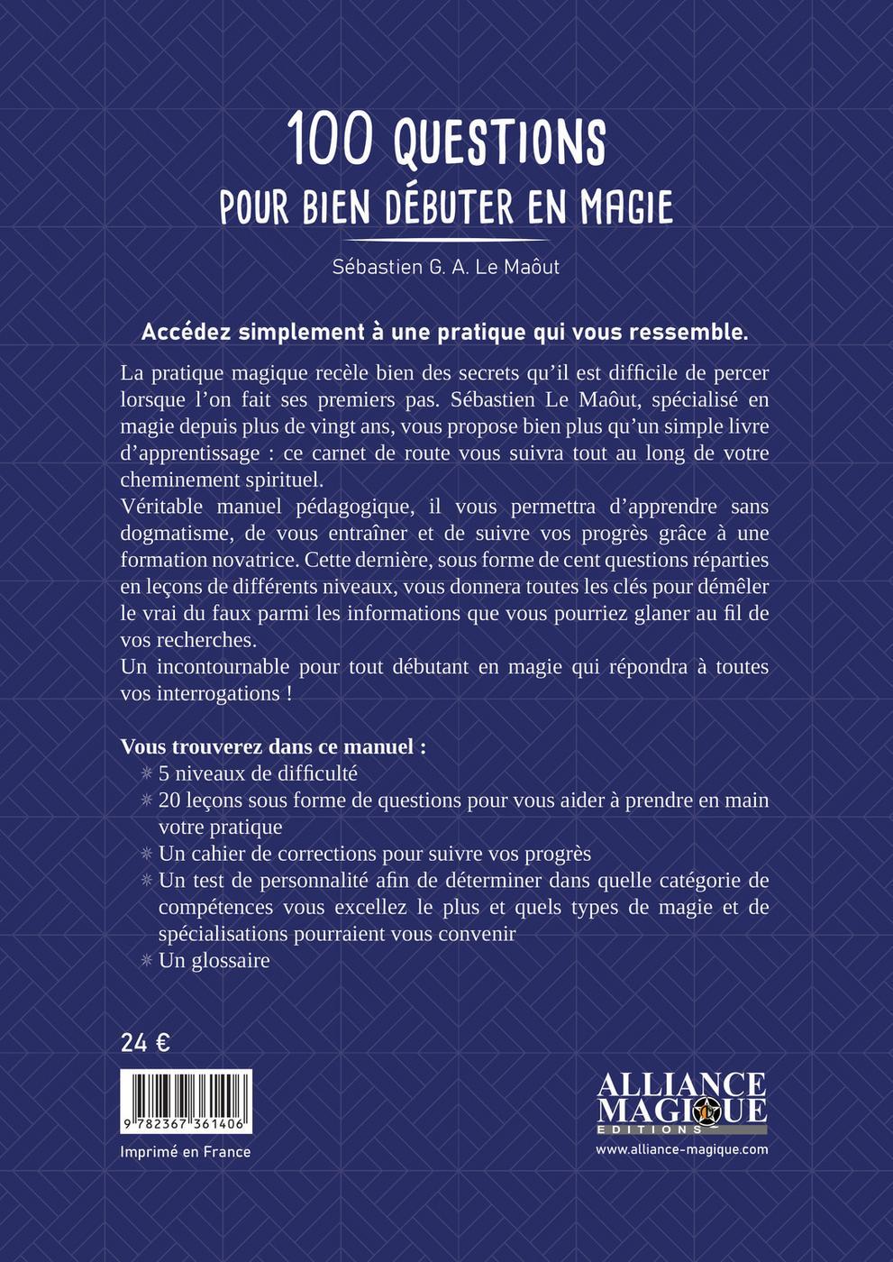 Accédez simplement à une pratique qui vous ressemble. La pratique magique recèle bien des secrets qu’il est difficile de percer lorsque l’on fait ses premiers pas. Sébastien Le Maôut, spécialisé en magie depuis plus de vingt ans, vous propose bien plus qu’un simple livre d’apprentissage : ce carnet de route vous suivra tout au long de votre cheminement spirituel. Véritable manuel pédagogique, il vous permettra d’apprendre sans dogmatisme, de vous entraîner et de suivre vos progrès grâce à une formation novatrice. Cette dernière, sous forme de cent questions réparties en leçons de différents niveaux, vous donnera toutes les clés pour démêler le vrai du faux parmi les informations que vous pourriez glaner au fil de vos recherches. Un incontournable pour tout débutant en magie qui répondra à toutes vos interrogations !