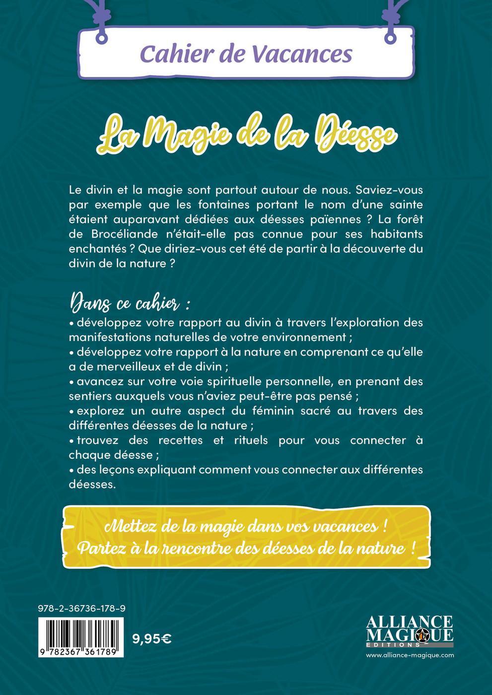 Le divin et la magie sont partout autour de nous. Saviez-vous par exemple que les fontaines portant le nom d'une sainte étaient auparavant dédiées aux déesses païennes ? La forêt de Brocéliande n'était-elle pas connue pour ses habitants enchantés ? Que diriez-vous de partir à la découverte du divin de la nature ? Dans ce cahier : développez votre rapport au divin à travers l'exploration des manifestations naturelles de votre environnement ; développez votre rapport à la nature en comprenant ce qu'elle a de merveilleux et de divin ; avancez sur votre voie spirituelle personnelle, en prenant des sentiers auxquels vous n'aviez peut-être pas pensé ; explorez un autre aspect du féminin sacré au travers des différentes déesses de la nature ; trouvez des recettes et rituels pour vous connecter à chaque déesse ; des leçons expliquant comment vous connecter aux différentes déesses.