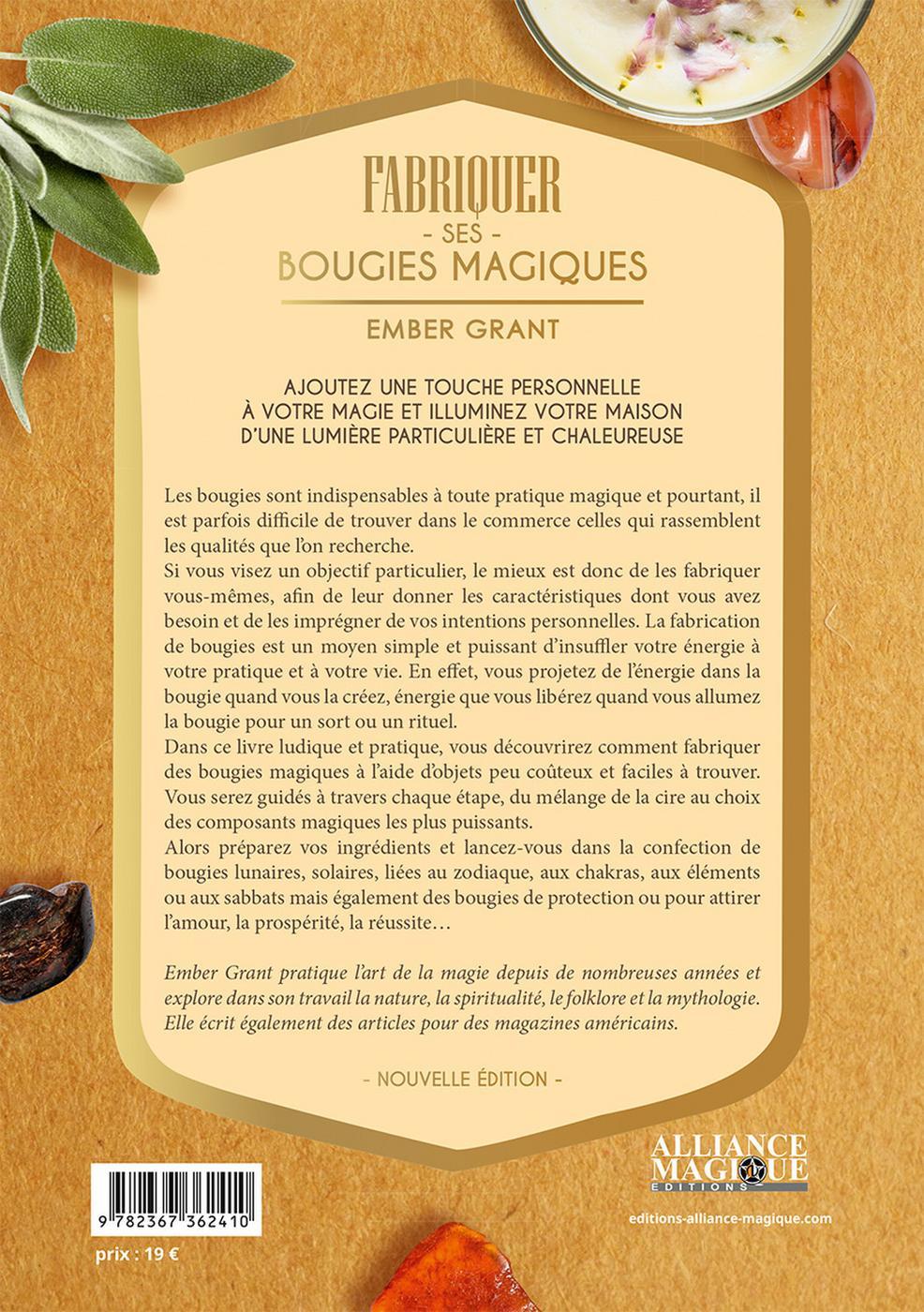 Les bougies sont indispensables à toute pratique magique et pourtant, il est parfois difficile de trouver dans le commerce celles qui rassemblent les qualités que l’on recherche. Si vous visez un objectif particulier, le mieux est donc de les fabriquer vous-mêmes, afin de leur donner les caractéristiques dont vous avez besoin et de les imprégner de vos intentions personnelles. La fabrication de bougies est un moyen simple et puissant d’insuffler votre énergie à votre pratique et à votre vie. En effet, vous projetez de l’énergie dans la bougie quand vous la créez, énergie que vous libérez quand vous allumez la bougie pour un sort ou un rituel. Dans ce livre ludique et pratique, vous découvrirez comment fabriquer des bougies magiques à l’aide d’objets peu coûteux et faciles à trouver. Vous serez guidés à travers chaque étape, du mélange de la cire au choix des composants magiques les plus puissants. Alors préparez vos ingrédients et lancez-vous dans la confection de bougies lunaires, solaires, liées au zodiaque, aux chakras, aux éléments ou aux sabbats mais également des bougies de protection ou pour attirer l’amour, la prospérité, la réussite…