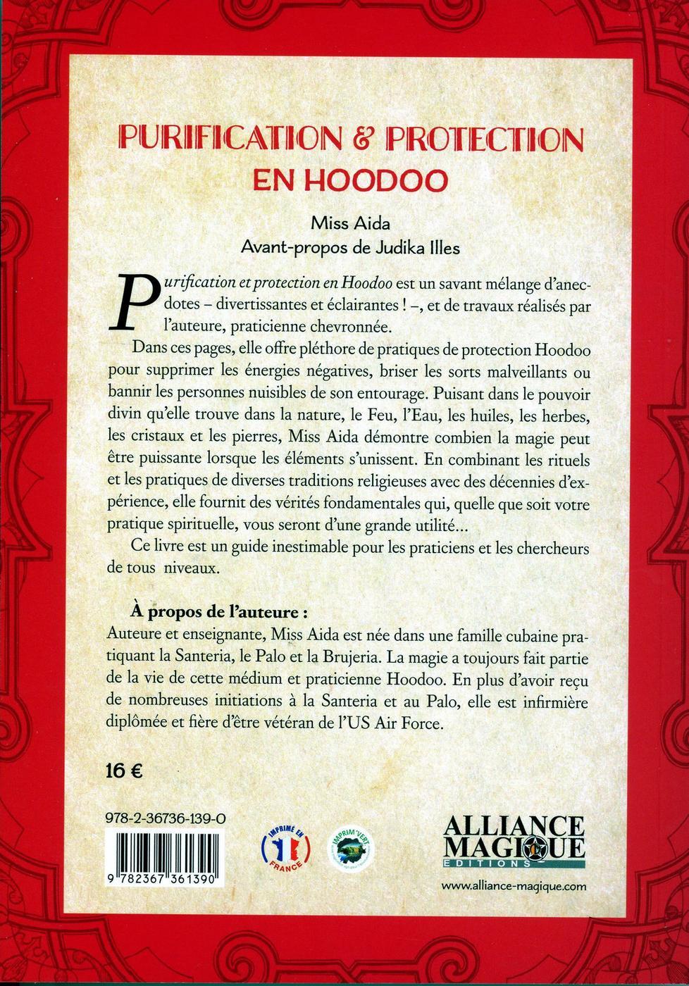Avant-propos de Judika Illes Purification et protection en Hoodoo est un savant mélange d’anecdotes – divertissantes et éclairantes ! –, et de travaux réalisés par l’auteure, praticienne chevronnée. Dans ces pages, elle offre pléthore de pratiques de protection ­Hoodoo pour supprimer les énergies négatives, briser les sorts malveillants ou bannir les personnes nuisibles de son entourage. Puisant dans le pouvoir divin qu’elle trouve dans la nature, le Feu, l’Eau, les huiles, les herbes, les cristaux et les pierres, Miss Aida démontre combien la magie peut être puissante lorsque les éléments s’unissent. En combinant les rituels et les pratiques de diverses traditions religieuses avec des décennies d’expérience, elle fournit des vérités fondamentales qui, quelle que soit votre pratique spirituelle, vous seront d’une grande utilité… Ce livre est un guide inestimable pour les praticiens et les chercheurs de tous niveaux.
