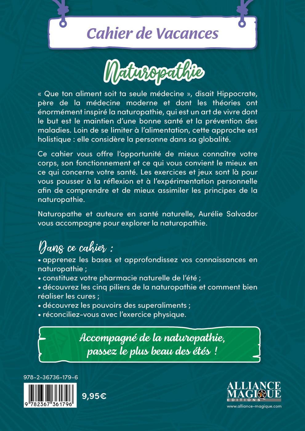 La naturopathie est un art de vivre dont le but est le maintien d'une bonne santé et la prévention des maladies. Loin de se limiter à l'alimentation, cette approche est holistique : elle considère la personne dans sa globalité. Ce cahier vous offre l'opportunité de mieux connaître votre corps, son fonctionnement et ce qui vous convient le mieux en ce qui concerne votre santé. Les exercices et jeux sont là pour vous pousser à la réflexion et à l'expérimentation personnelle afin de comprendre et de mieux assimiler les principes de la naturopathie. Dans ce cahier : apprenez les bases et approfondissez vos connaissances en naturopathie ; constituez votre pharmacie naturelle de l'été ; découvrez les cinq piliers de la naturopathie et comment bien réaliser les cures ; découvrez les pouvoirs des super aliments ; réconciliez-vous avec l'exercice physique.