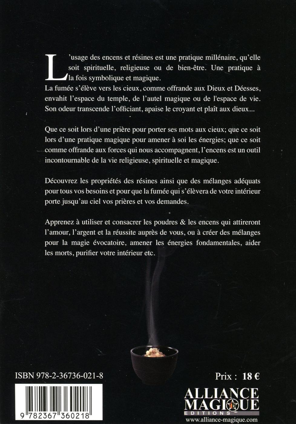 L'usage des encens et résines est une pratique millénaire, qu'elle soit spirituelle, religieuse ou de bien-être. Une pratique à la fois symbolique et magique. La fumée s'élève vers les cieux, comme offrande aux Dieux et Déesses, envahit l'espace du temple, de l'autel magique ou de l'espace de vie. Son odeur transcende l'officiant, apaise le croyant et plaît aux dieux... Que ce soit lors d'une prière pour porter ses mots aux cieux ; que ce soit lors d'une pratique magique pour amener à soi les énergies ; que ce soit comme offrande aux forces qui nous accompagnent, l'encens est un outil incontournable de la vie religieuse, spirituelle et magique. Découvrez les propriétés des résines ainsi que des mélanges adéquats pour tous vos besoins et pour que la fumée qui s'élèvera de votre intérieur porte jusqu'au ciel vos prières et vos demandes. Apprenez à utiliser et consacrer les poudres & les encens qui attireront l'amour, l'argent et la réussite auprès de vous, ou à créer des mélanges pour la magie évocatoire, amener les énergies fondamentales, aider les morts, purifier votre intérieur etc.
