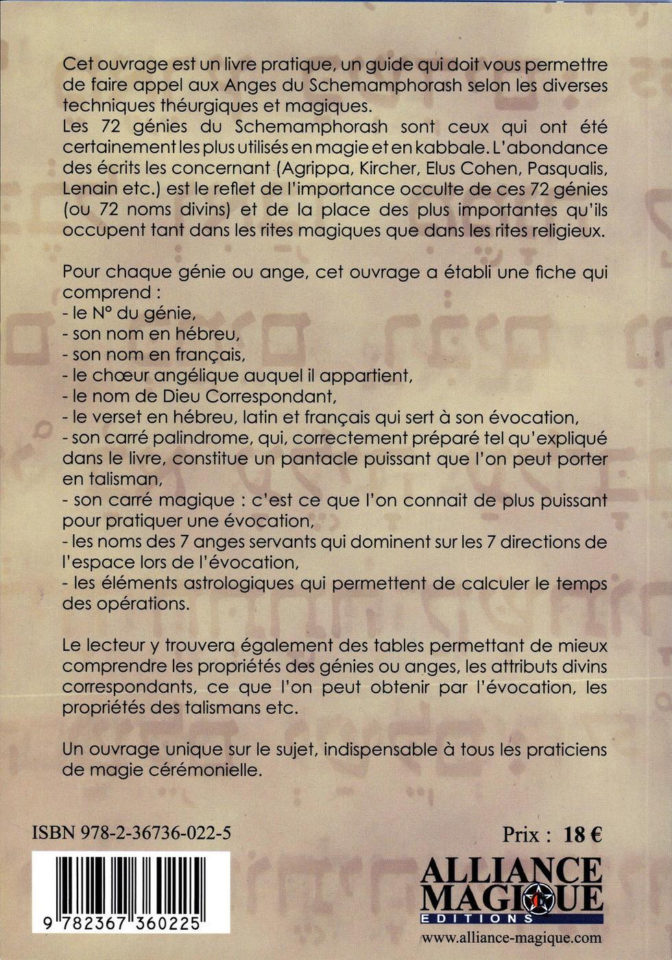 Cet ouvrage est un livre pratique, un guide qui doit vous permettre de faire appel aux Anges du Schemamphorash selon les diverses techniques théurgiques et magiques. Les 72 génies du Schemamphorash sont ceux qui ont été certainement les plus utilisés en magieeten kabbale. L'abondance des écrits les concernant (Agrippa, Kircher, Elus Cohen, Pasqualis, Lenain etc.) est le reflet de l'importance occulte de ces 72 génies (ou 72 noms divins) et de la place des plus importantes qu'ils occupent tant dans les rites magiques que dans les rites religieux. Pour chaque génie ou ange, cet ouvrage a établi une fiche qui comprend : le n° du génie, son nom en hébreu, son nom en français, le choeur angélique auquel il appartient, le nom de Dieu Correspondant, le verset en hébreu, latin et français qui sert à son évocation, son carré palindrome, qui, correctement préparé tel qu'expliqué dans le livre, constitue un pantacle puissant que l'on peut porter en talisman, son carré magique : c'est ce que l'on connaît de plus puissant pour pratiquer une évocation, les noms des 7 anges servants qui dominent sur les 7 directions de l'espace lors de l'évocation, les éléments astrologiques qui permettent de calculer le temps des opérations. Le lecteur y trouvera également des tables permettant de mieux comprendre les propriétés des génies ou anges, les attributs divins correspondants, ce que l'on peut obtenir par l'évocation, les propriétés des talismans etc. Un ouvrage unique sur le sujet, indispensable à tous les praticiens de magie cérémonielle.