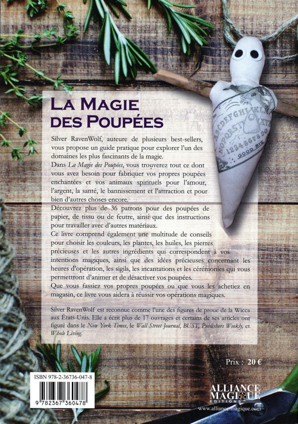 Silver RavenWolf, auteure de plusieurs best-sellers, vous propose un guide pratique pour explorer l'un des domaines les plus fascinants de la magie. Dans La Magie des poupées, vous trouverez tout ce dont vous avez besoin pour fabriquer vos propres poupées enchantées et vos animaux spirituels pour l'amour, l'argent, la santé, le bannissement et l'attraction et pour bien d'autres choses encore. Découvrez plus de 36 patrons pour des poupées de papier, de tissu ou de feutre, ainsi que des instructions pour travailler avec d'autres matériaux. Ce livre comprend également une multitude de conseils pour choisir les couleurs, les plantes, les huiles, les pierres précieuses et les autres ingrédients qui correspondent à vos intentions magiques, ainsi que des idées précieuses concernant les heures d'opération, les sigils, les incantations et les cérémonies qui vous permettront d'animer et de désactiver vos poupées. Que vous fassiez vos propres poupées, ou que vous les achetiez en magasin, ce livre vous aidera à réussir vos opérations magiques.