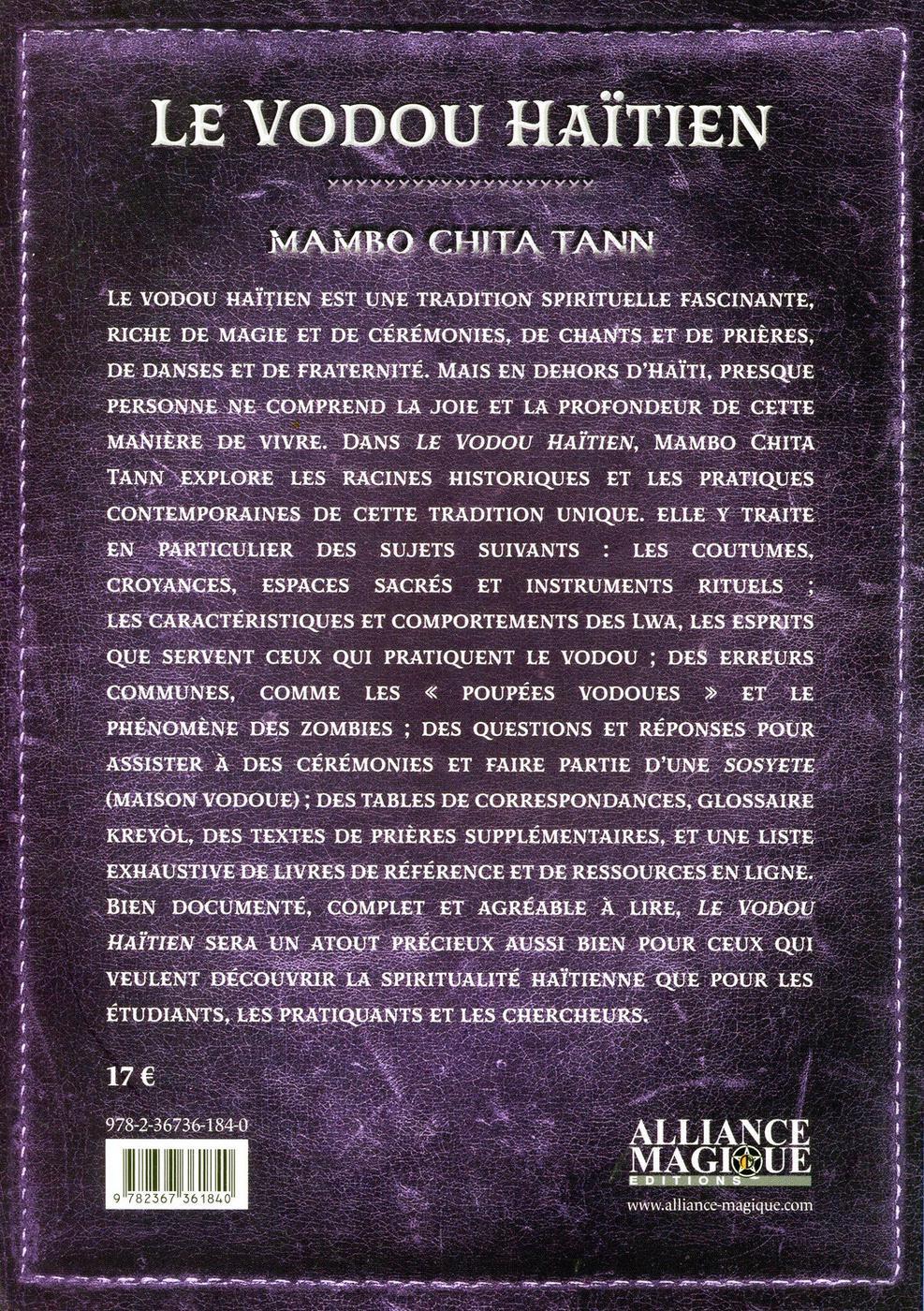 Le vodou haïtien est une tradition spirituelle fascinante, riche de magie et de cérémonies, de chants et de prières, de danses et de fraternité. Mais en dehors d'Haïti, presque personne ne comprend la joie et la profondeur de cette manière de vivre. Dans "Le Vodou Haïtien", Mambo Chita Tann explore les racines historiques et les pratiques contemporaines de cette tradition unique. Elle y traite en particulier des sujets suivants : les coutumes, croyances, espaces sacrés et instruments rituels ; les caractéristiques et comportements des Lwa, les esprits que servent ceux qui pratiquent le vodou ; des erreurs communes, comme les "poupées vodoues" et le phénomène des zombies ; des questions et réponses pour assister à des cérémonies et faire partie d'une sosyete (maison vodoue) ; des tables de correspondances, glossaire kreyol, des textes et prières supplémentaires, et une liste exhaustive de livres de référence et de ressources en ligne. Bien documenté, complet et agréable à lire, "Le Vodou Haïtien" sera un atout précieux aussi bien pour ceux qui veulent découvrir la spriritualité haïtienne que pour les étudiants, les pratiquants et les chercheurs.